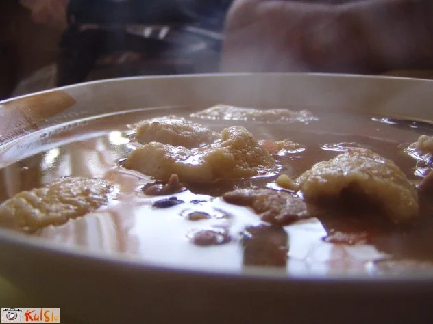 5. Povečamo plin. Ko juha začne vreti, vzamemo maso za smrčke. Z žličko zajemamo maso in jo dajemo v juho. Ponavljamo, dokler mase ne zmanjka. Zdaj lahko plin zmanjšamo. Počakamo še 10 do 15 minut, da se smrčki skuhajo. Preden enolončnico postrežemo, iz nje odstranimo še čebulo.