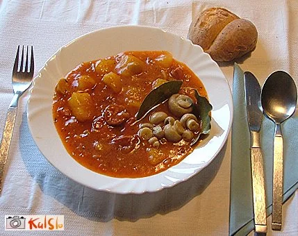 Na olivnem olju pražimo čebulo in klobaso, da porumeni, dodamo šampinjone, papriko, paradižnikovo mezgo in moko, dobro premešamo, dodamo kuhan krompir skupaj z vodo, v kateri se je kuhal, lovor, timijan, majaron in kumino. Med mešanjem dobro prevremo in postrežemo s polnozrnatim kruhom. Poleg se poda solata (motovilec, radič, zelena solata...).