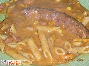 Klobaso narežemo na tanka kolesca, lahko pa jo pol narežemo, pol pa pustimo celo. V večjem loncu (kjer se bo kuhala mineštra), klobaso (kar je narezane) prepražimo, ne preveč. Dolijemo zmleto mešanico. Dodamo, če smo pustili kaj cele klobase, na kolesca narezan korenček, paradižnikov sok, če pa smo imeli svež paradižnik ali pelate, ga dodamo že prej tja, kjer se je mlelo. Istočasno dodamo drugo konzervo fižola (na cedilu opran in odcejen) in koruzo. Malo pomešamo, dodamo kaki dve pesti testenin (najboljše so penne rigate, lahko pa so tudi polžki oz. karkoli po izbiri. Če damo špagete, jih nalomimo na dolžino 2 - 3 cm.) Ko so testenine kuhane, je jed gotova.