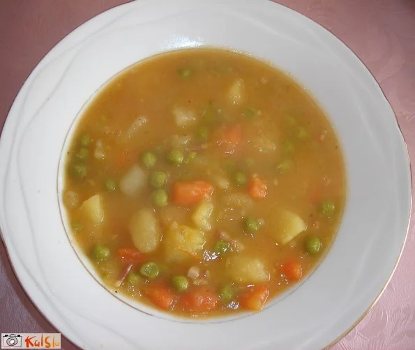 5Na olju prepražimo čebulo, dodamo malo narezane pancete (po želji). Če je paradižnik svež, ga narežemo na drobno in dušimo s čebulo. Dolijemo vodo, nato dodamo grah, korenček, narezan na kolobarje in na kocke narezan krompir. Kuhamo do mehkega, začinimo, dodamo jušno kocko in papriko. Ko je gotovo, lahko malo krompirja pretlačimo z vilico, da dobimo primerno gostoto. Potresemo s sesekljanim peteršiljem.
