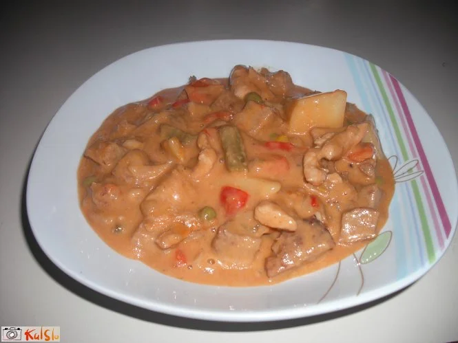 5Puranja prsa narežemo na kose in popražimo na malo olja. Meso odstranimo iz ponve in dodamo narezano zelenjavo, jo pražimo par minutk, nato vrnemo meso in zalijemo z malo vode. Solimo, popramo, dodamo malo sojine omake (količina je po želji, lahko jo tudi izpustite) in pustimo, da se duši. Med tem časom skuhamo krompir in ga odcedimo ter dodamo k jedi. Jed zgostimo s smetano in paradižnikovo mezgo in še malo pokuhamo.