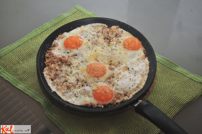 V ponvi segrejemo veliko žlico masla, nato dodamo jurčke. Po 2-3 minutah dodamo česen in pražimo okoli 2-3 minute, dodamo jajčka in nanje naribamo sir ter posujemo z origanom... Med tem dodamo še žlico kisle smetane in to je to :) Postrežemo s kosom kruha.