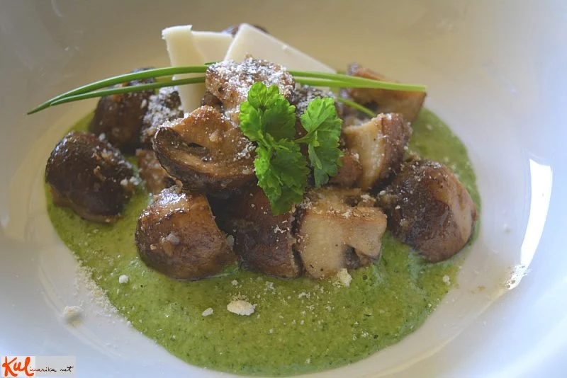 na krožnik damo 3- 4 jž pesta in s krožnimi gibi krožnika pesto enakomerno porazdelimo. Na sredino pesta dodamo pečene šampinjone, začinimo s ponarejenim parmezanom in pokapljamo z ekstra deviškim oljem.