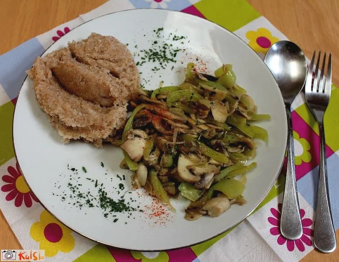 Čebulo narežemo na tanke kolobarje, papriko na 5 cm dolge tanke palčke, šampinjone na koščke. Na oljčnem olju čebulo rahlo popražimo, samo toliko, da postekleni, dodamo papriko in šampinjone in vse skupaj 15 minut pražimo, tako da se šampinjoni zmehčajo in povežejo z ostalimi sestavinami, rahlo posolimo. Po želji dodamo tudi poper in jed takoj postrežemo. Zraven ponudimo široke rezance, riž ali polnovredni zdrob.