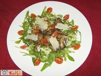 Gobice spečemo na olivnem olju in jih solimo. Ta čas pripravimo solato. Vse tri vrste solate damo na krožnik, pokapamo z olivnim oljem, solimo, kisamo in zmešamo. Po vrhu naložimo gobice, zrezane paradižnike in narezan sir.