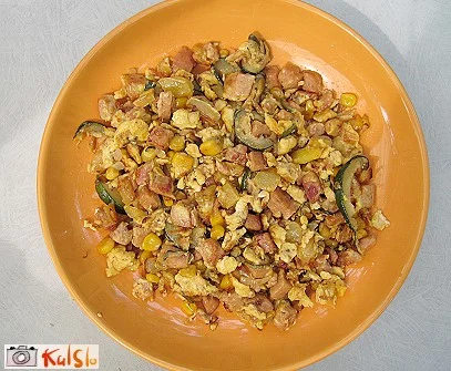 Na malo olja prepražimo na kolobarje narezane bučke, ki jih prej operemo, dodamo na kocke narezano papriko in oplaknjeno koruzo, ko se vse to malo popraži in zmehča, dodamo na kocke narezan narezek in še malo popražimo. Nato posebej v skledi razžvkljamo 6 jajc in jih dodamo popraženi mešanici. Mešamo, dokler jajca ne zakrknejo. Malo še solimo (ne preveč, narezek je že slan), popramo, dodamo še kakšno začimbo po želji.
