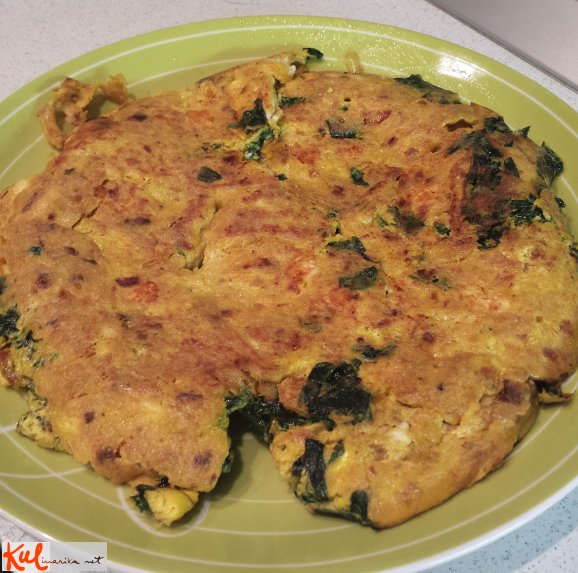Ko špinača upade, jo enakomerno porazdelimo po ponvi in prelijemo z mešanico. Na majhnem ognju pečemo, previdno obrnemo (bolj previdno kot sem jo jaz) in voilà.