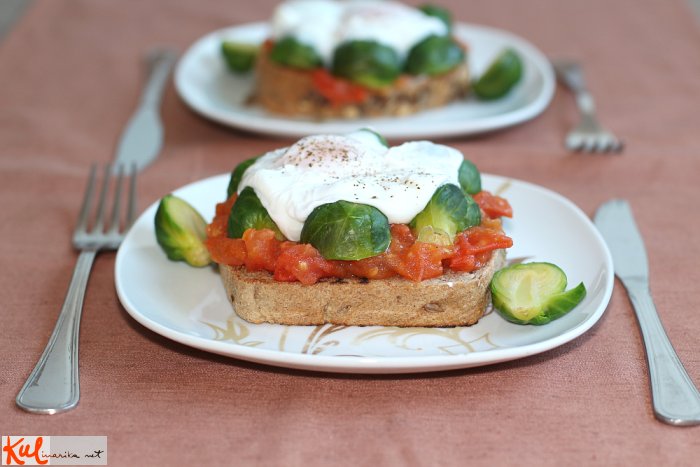 poširano jajce na kruhu s paradižnikom in brstičnim ohrovtom je odlična jed za zajtrk