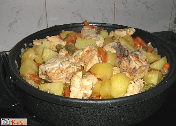 Narežemo čebulo in jo popražimo v pekaču, dodamo na manjše kose narezano meso in dušimo okrog 10 minut. Vsujemo zelenjavo (lahko je iz vrta - je še bolje) in mešamo (v eno posodo vlijemo 2 dl vode in raztopimo kocko), dolijemo "juhico" in solimo. Kuha naj še 20 minut!!