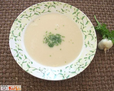 V drugi posodi na maslu rahlo popražimo moko, da postane rahlo rjavkasta. Čez to prelijemo česnovo vodo in dobro zmešamo. Temu dodamo mleko, približno pol dl. Po občutku. Odstavimo jo z ognja in vlijemo prej razžvrkljano jajce. Z metlico dobro mešamo. Dodamo sol, poper, peteršilj in druge začimbe po okusu. Če je juha preredka, jo vremo toliko časa, da postane gostejša.