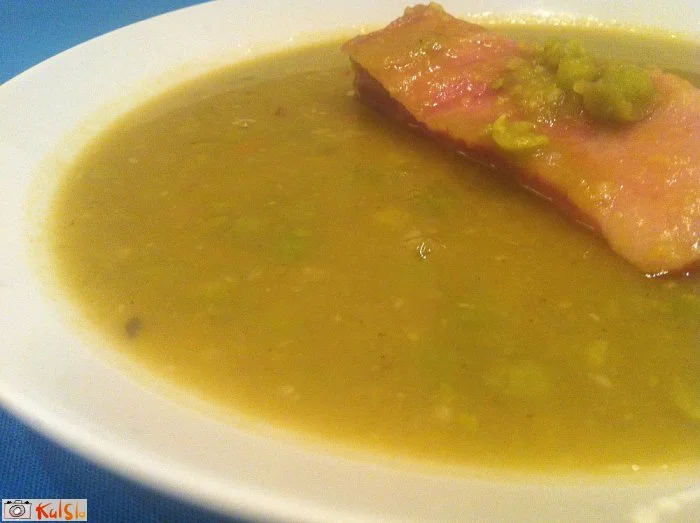 Na oljčnem olju prepražimo drobno nasekljane šalotke, dodamo česen in pražimo toliko, da zadiši. V lonec vsujemo suhe grahove polovičke in zalijemo z vodo. Dodamo na kose narezana svinjska rebrca, solimo in kuhamo uro, uro in pol na nizkem ognju, dokler grahove polovičke ne začnejo razpadati. Nato dodamo zamrznjen grah, timijan (po možnosti svež), poper in mleto rdečo papriko. Povečamo temperaturo, da juhica spet zavre, nato na nizkem ognju kuhamo vsaj še pol ure. Če se nam juha zdi preredka, lahko nekaj graha zmečkamo s kuhalnico. Dober tek!