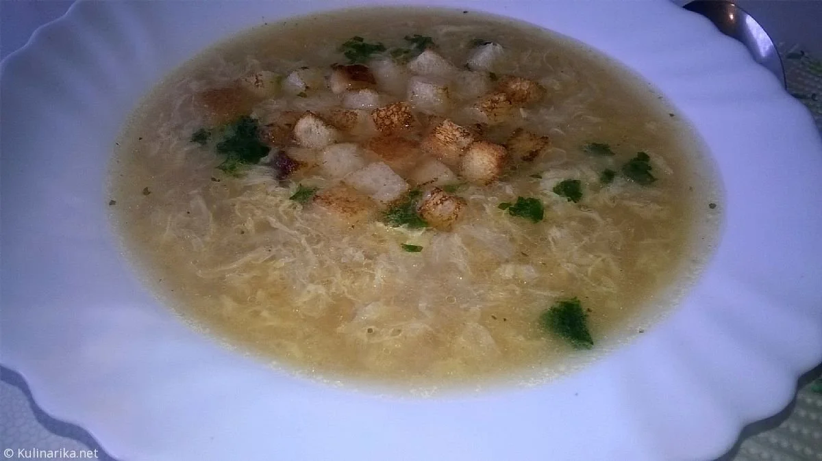3. V tem času razžvrkljamo jajci (lahko damo le 1 jajce in kakšen beljak, ki je ostal od peke krofov) in ga med stalnim mešanjem počasi, v tankem curku, prilivamo v juho. Kuhamo še 5 minut.