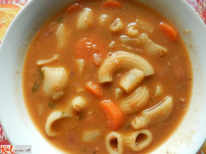 Na malo olja ovenemo drobno sesekljano čebulo, dodamo sesekljan česen in pražimo, da zadiši. Dodamo za eno pest gomoljne zelene, narezane na drobne kockice, korenček narezan na kolobarčke, prilijemo paradižnikovo mezgo in vino, dodamo šetraj, majaron, lovorjev list, sladkor in kajenski poper ter kuhamo, da alkohol izhlapi. Zalijemo z zelenjavno osnovo in zavremo. Ko zavre, temperaturo znižamo in dodamo testenine. Ko so testenine kuhane, dodamo kuhan fižol (lahko tudi iz konzerve), odstavimo, solimo, popramo in dodamo sesekljano peteršiljevo listje. Ponudimo kot samostojen lažji obrok ali juho.