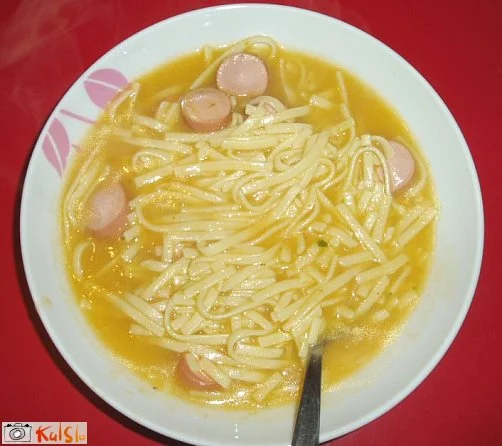 V veliko ponev, najboljše vok, damo malo olja. Nato dodamo čebulo in na zelo majhne koščke narezano korenje (najboljše je, če ga naribamo), zamrznjeno zelenjavo, ščepec peteršilja in vegeto. To najprej malo popražimo (da se vse zmehča), nato pa zalijemo z 2 dl vode, da se kuha v njej nekaj časa. Ko je zelenjava kuhana, ji dodamo žličko kisle smetane in zelenjavno kocko. Kuhamo še 10 minut. Nato vse skupaj zmešamo s paličnim mešalnikom, dokler ni videti nobenega koščka zelenjave. To potem zalijemo z litrom vode in v njem skuhamo rezance in na koščke narezane hrenovke. Solimo po okusu.