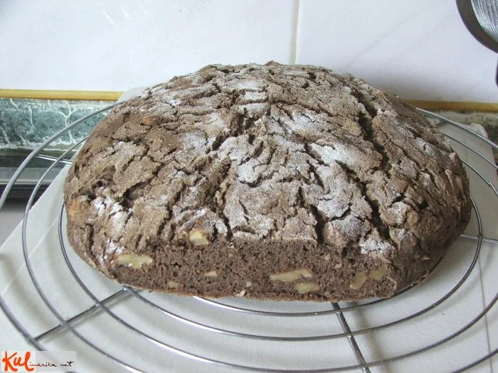 Kvas pomešamo med moko, nato pa navedene sestavine zmešamo s kuhalnico. Pokrito pustimo vzhajati na toplem na dvojni volumen. Primešamo orehe in maso prestavimo na pekač, obložen s peki papirjem ter jo z mokro žlico oblikujemo v hlebček, ki ga posujemo z moko in pokritega vzhajamo tako dolgo, da površina razpoka - cca. 30 minut.