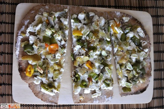 S čopičem premažemo za žlico olja po celotni površini. Obložimo z rikoto in zelenjavo: na majhne kocke narezane bučke, kolobarje mlade čebule, narezano papriko in listi artičoke. Spečemo v pečici pri 250 stopinjah. Potresemo z nastrgano limonino lupinico in narežemo na manjše podolgovate kose. Dober tek!
