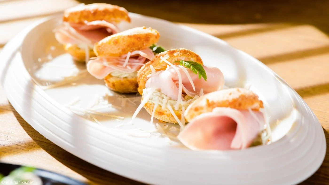 Kruhki sconi s čedarjem, bučnim namazom in kuhanim pršutom