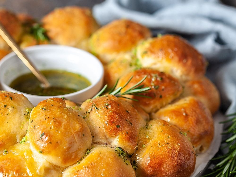 zmagovalec vsake zabave, ta kruhov venec bo pravi hit! Premažemo ga s slastno masleno česnovo polivko, ki jo dodamo še v osrednji lonček, kamor lahko kruhke dodatno pomakamo.