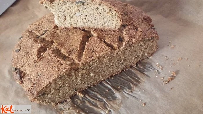 Iz sestavin oblikujemo hlebec in pečemo prvih 10 minut na 200 stopinjah, potem zmanjšamo na 180 stopinj in pečemo dodatnih 40 minut. Preverimo z leseno palčko, če je pečeno.