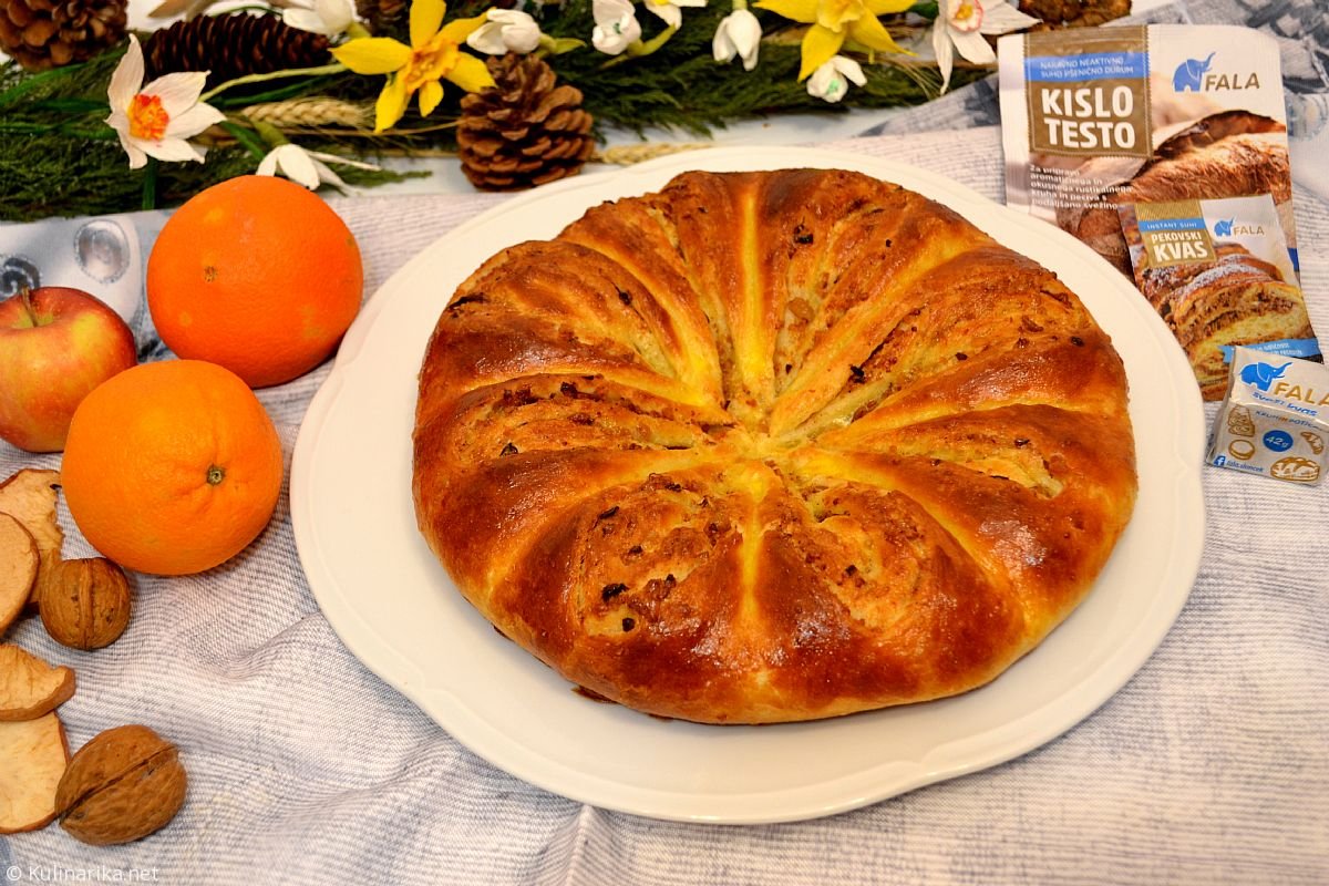 Oblikovano pogačo damo na toplo vzhajati. Ko je pogača vzhajala, z ročajem majhne kuhalnice odtisnemo črto od zunanje strani proti sredini pogače na sredini vsakega lista, da se zunanje plasti razprejo in ustvarijo lep vzorec.
