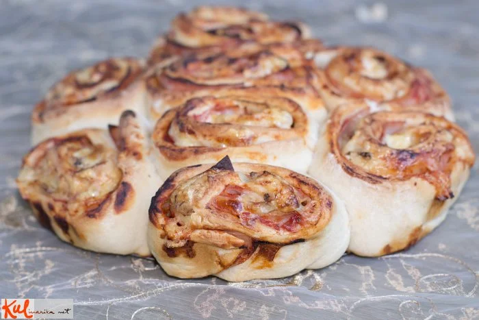Najprej naredimo pica testo, lahko uporabimo svojo taktiko ali pa naredimo sledeče: v posodo damo moko, naredimo v njej luknjo, v katero damo kvas, sol potisnemo v moko, da se ne stika s kvasom, nato pa na kvas dolijemo mlačno vodo. Z žlico mešamo iz sredine navzven dokler gre, nato pa nadaljujemo mesenje z rokami, dokler ne dobimo povezanega testa. Posodo potresemo z moko, nato položimo noter testo in ga pokapljamo z oljem ter posodo pokrijemo s krpo in damo vzhajati na toplo mesto za vsaj 20 minut. Operemo in narežemo šampinjone. Potem testo razvaljamo na nekaj moke v obliko pravokotnika. Namažemo s paradižnikovo mezgo in solimo ter posipamo z origanom. Položimo rezine šunke, šampinjone in posipamo z naribanim sirom. Vse skupaj zavijemo v rulado in jo narežemo na ne prevelike kose ter jih zlagamo v okrogel pekač en ob drugega, da se stikajo. Lahko tudi malenkost potisnemo, da dobimo okroglo obliko. Nato pripravljeno pečemo v pečici na 250 stopinjah 20 minut in pustimo, da se malenkost ohladi ter postrežemo.