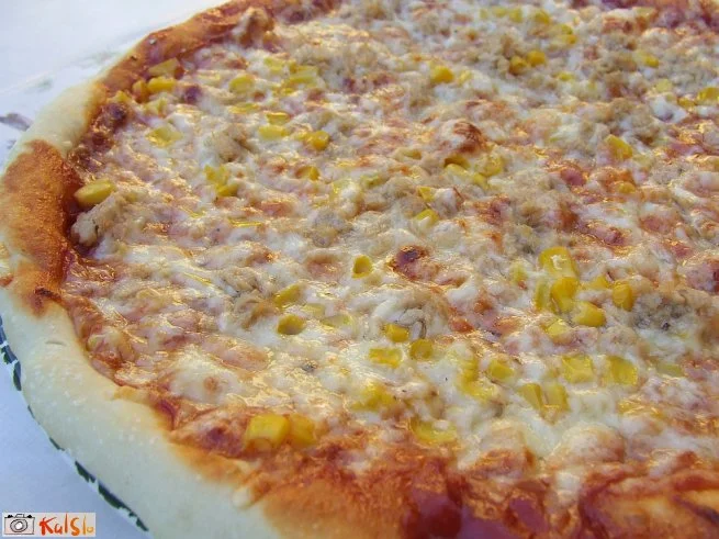 Vzhajano testo razpotegnemo na pomaščen pekač, ga namažemo s kečapom, začinimo z baziliko in origanom in dodamo nariban sir. Pločevinki tune odlijemo olje in tuno razporedimo po pekaču. Koruzo oplaknemo pod vodo in potresemo po pizzi. Na pekaču vzhajamo še 10 minut (oz. dokler se pečica ne segreje). Pečemo na 210 stopinjah približno 10 minut.