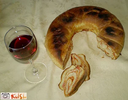 Sem jo delala čisto po svoje iz trenutnega navdiha, testo pa sem naredila iz moke, kvasa, rumenjakov, mleka, soli in masla. Filo sem naredila iz čebul, česna, paradižnika, paprike, suhe salame, sira in začimb.