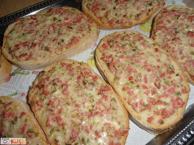 Namaz nanesemo na rezine kruha, vse skupaj zložimo v pekač in pečemo na 200 stopinjah, da se sir stopi in malo zapeče (približno 10 - 15 minut).