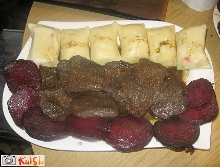 Na servirni krožnik naložimo zrezke in jih prelijemo z omako. Zraven postrežemo kuhane sirove štruklje in rezine opečene rdeče pese. To pripravimo tako, da kuhano peso zrežemo na pol cm debele kolobarje in jo opečemo na maslu, potresemo s cimetom, ko jo damo na servirni krožnik, pa na vsako rezino damo še žličko medu.