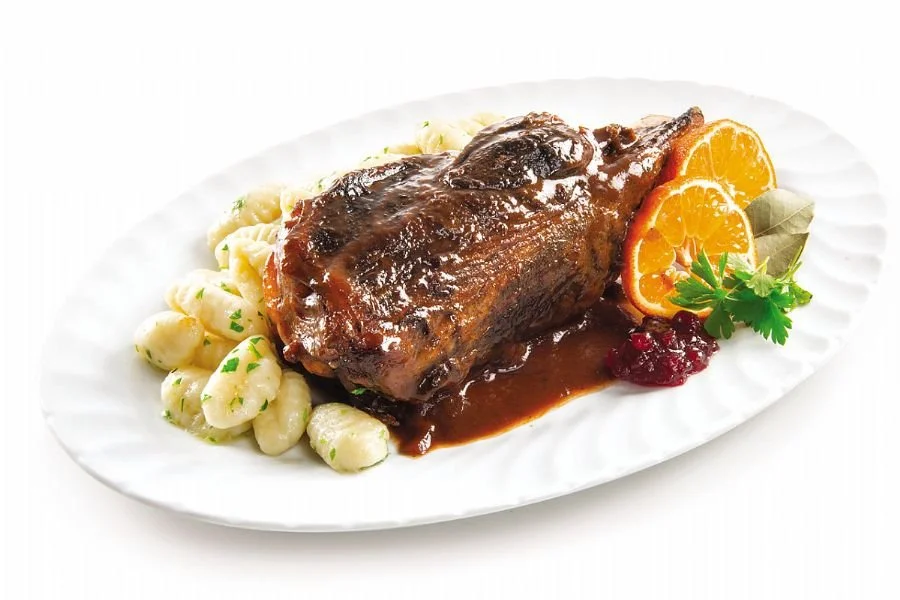 Krače: soljene in poprane krače na olju z vseh strani dobro popečemo. Popečene postavimo v pečico na rešetko in jih pri 80 stopinjah počasi pečemo približno 4 ure. Pod rešetko postavimo posodo, v katero bo odtekal mesni sok. Po 3 urah v velikem loncu na olju prepražimo očiščeno in na približno 1 cm velike kocke narezano korenje, zeleno, por in čebulo. Dodamo in na hitro prepražimo še mezgo, nato vse skupaj najprej zalijemo z vinom, nato pa z jušno osnovo in mesnim sokom, ki se je med peko krač nabral v posodi pod rešetko. Primešamo še brinove jagode in lovorjeva lista in počasi kuhamo. Čez približno 1 uro krače vzamemo iz pečice, jih položimo na zelenjavo in vse skupaj kuhamo še 30 minut. Nato krače vzamemo iz posode in jih postavimo na toplo. Omako precedimo skozi fino cedilo, jo še enkrat na hitro prevremo ter obogatimo z brusničnim džemom in sladko smetano.