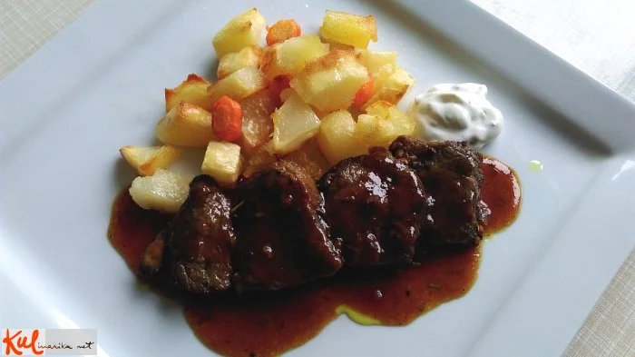 Jagnječje stegno narežemo na rezine, prelijemo z omako in ponudimo z dodatkom kisle smetane ali jogurta.