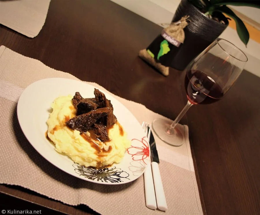 2. Medtem skuhamo krompir in naredimo pire. Ko so rebra skuhana, jih odstranimo in precedimo omako. Dodamo žlico žar omake ter omako prevremo, da se zgosti.