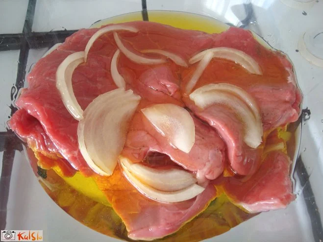 V shranjevalno posodo s pokrovom damo eno plast na polmesece narezane čebule. Na to plast položimo osoljene goveje zrezke, čez damo zopet plast čebule in postopek ponovimo za vse zrezke. Zadnja plast je plast čebule. Vse skupaj prelijemo z olivnim oljem, toliko, da prekrijemo vse zrezke. Posodo zapremo in hranimo v hladilniku vsaj 2 dni!