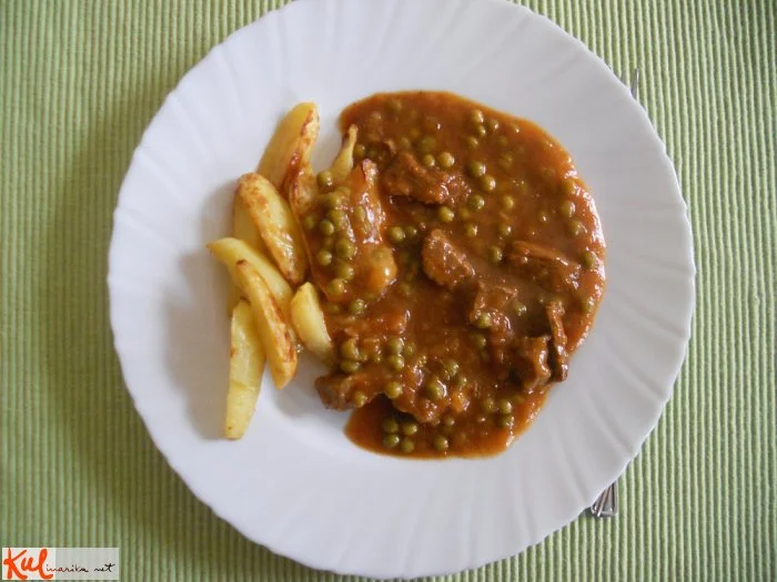 Popražim rdečo čebulo, dodam česen, goveje zrezke (potolčem jih prej) ,dodam grah+korenček, zalijem z argo kocko 3dcl+solim ,popram,curry,peteršilj,muškat.... Dušim 1 uro, na koncu dodam kislo smetano in postrezem z zeleno solato in pire krompirjem. Bon apetit vsem:)