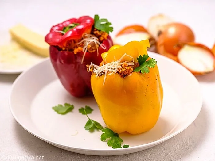 Pečico ogrejemo na 200 stopinj. Najprej na ponvi in oljčnem olju prepražimo čebulo, nato dodamo paradižnikovo omako in nasekljan česen. Dodamo še govedino, narezano na trakce. Skuhamo kvinojo in ji dodamo posušen origano. Kvinojo dodamo govedini. Papriki na vrhu prerežemo in ju postavimo na pekač, namazan z oljem. V papriki najprej naložimo govedino z omako in kvinojo, nato pa po želji po vrhu posujemo še sir. Pečemo pokrito s folijo, dokler se papriki ne zmehčata – med 20 in 30 minut. Postrežemo s sveže posutim peteršiljem.