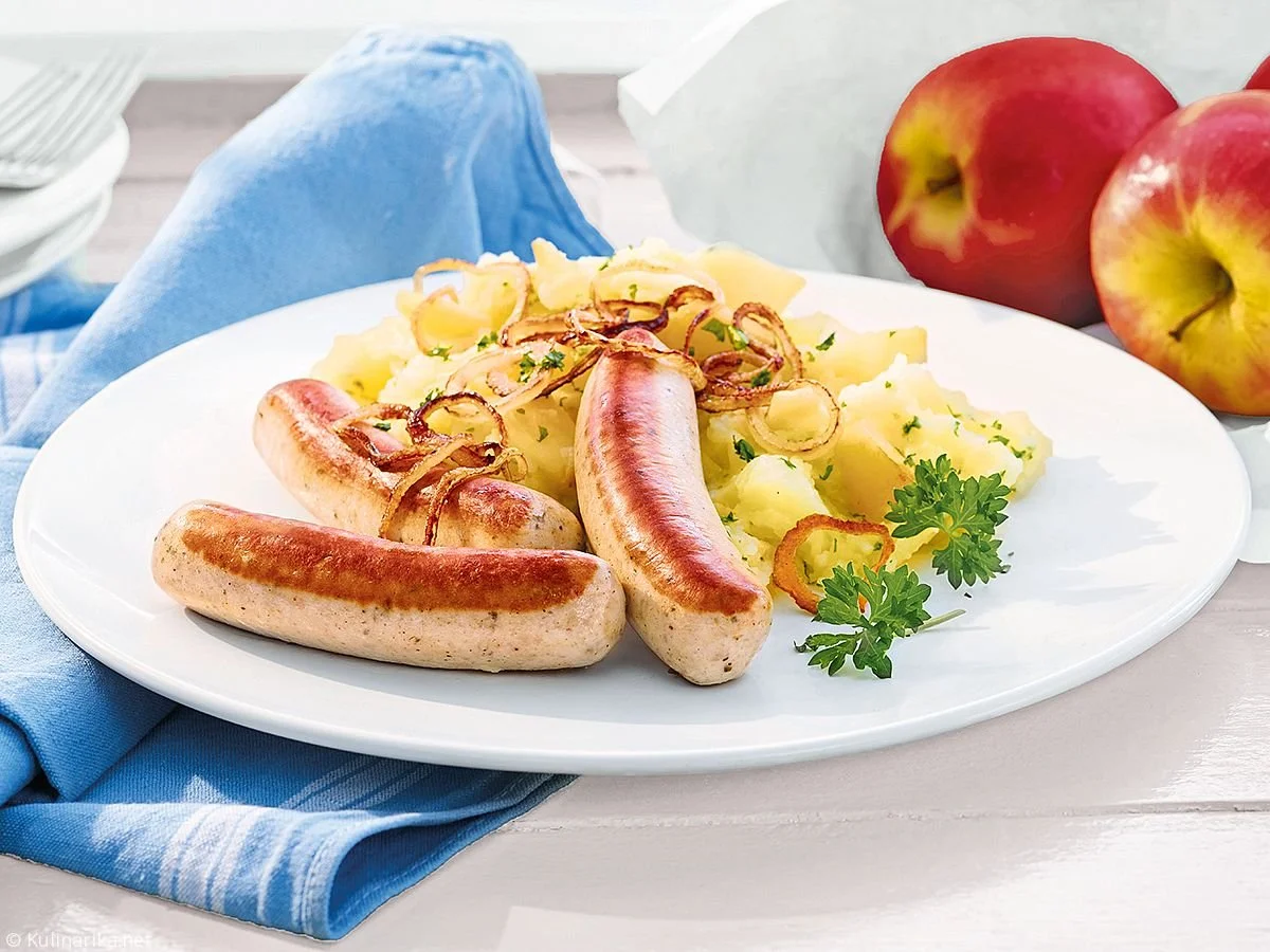 4. Krompir odcedimo. Skupaj z jabolki ga damo nazaj v lonec, zalijemo s toplim mlekom ter pretlačimo v pire. Solimo, popramo in vmešamo peteršilj. Pečenice in pire nadevamo na krožnike, po vrhu pa razporedimo popečene čebulne kolobarčke.