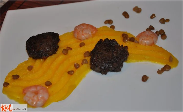 Na krožnik serviramo bučni pire z lečo, nato dodamo polpete in kozice.
