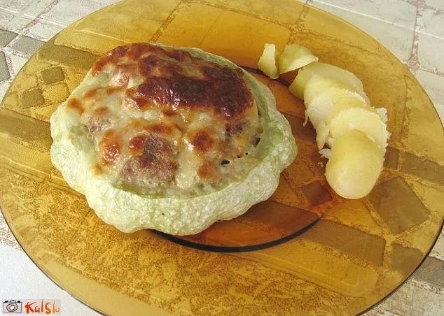 bela okrogla bučka, polnjena s pripravljeno mešanico mletega in bučkinega mesa ter dodatkov