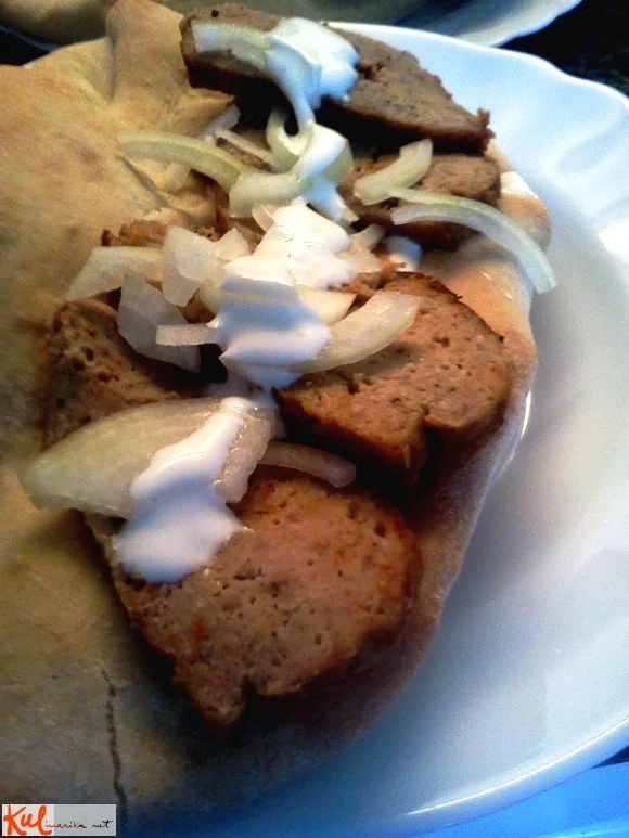 Meso položimo na vrh pita kruhka, dodamo jogurtov preliv in ostale dodatke, ter prepognemo.