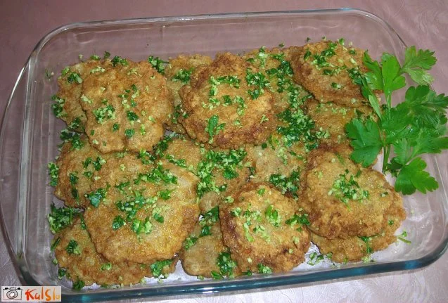 Iz mase naredimo polpete in jih paniramo (najprej v moki, potem v umešanih jajcih, ki smo jih solili) ter položimo v vroče olje (pazimo, da se olje ne zažge, ker ga bomo potem uporabili za omako). Med pečenjem jih obrnemo in ko so polpete pečene, jih damo v podolgovato posodo (najboljši je stekleni pekač). Lepo jih zložimo, po vrhu damo sesekljan česen in peteršilj, nato spet polpete, pa česen in peteršilj in tako vse dokler ne porabimo sestavin.