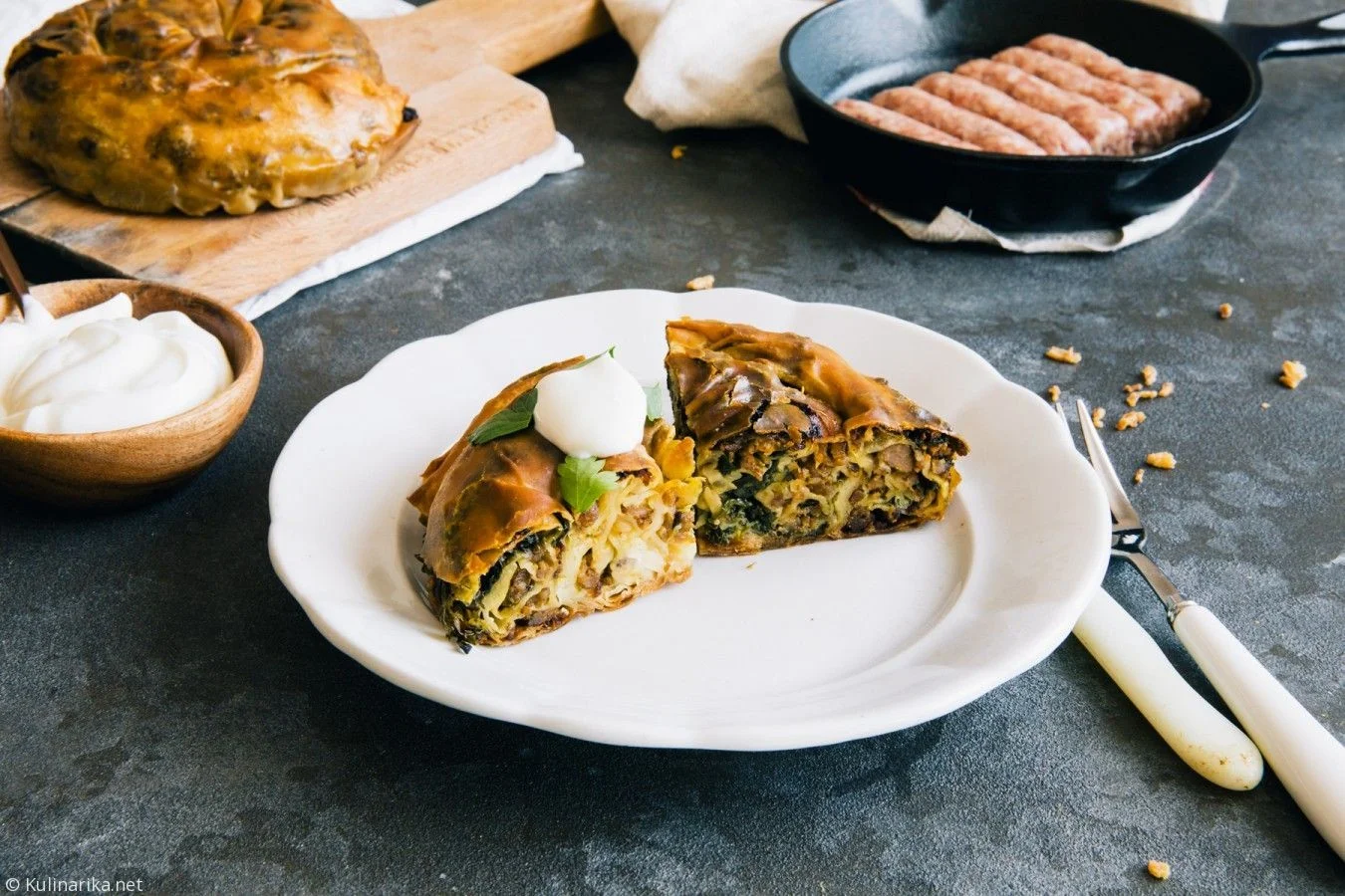 List vlečenega testa dobro premažemo z rastlinskim oljem. Po celotni površini testa razporedimo mešanico mesa in zelenjave. Tesno zvijemo v rolado. Rolado zvijemo v obliki polža in postavimo v manjši litoželezni pekač. Premažemo z rastlinskim oljem. Postavimo v pečico in pečemo 35 – 40 minut. Zadnjih 10 minut pečenja zavitek prelijemo s hladno vodo in pečemo še 10 minut.