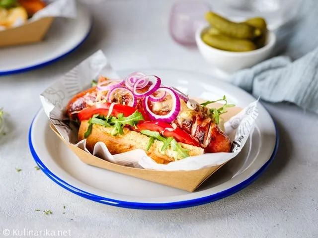 Pristna kranjska klobasa v hrustljavi bageti s topljenim sirom ementaler, dimljenm tofujem, rdečo čebulo in svežim paradižnikom.