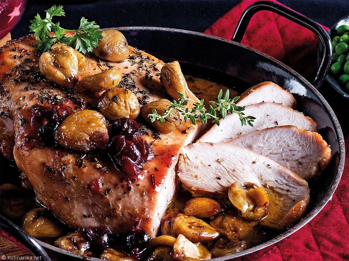 Belo vino in med segrevamo v majhnem loncu, dokler ne povre približno 2/3 tekočine. Dodamo 100 g masla, začimbe in limonino lupinico, dobro premešamo in za približno 2 uri postavimo v hladilnik. Puranje prsi solimo, natremo s pripravljeno masleno zmesjo in položimo v ognjevaren pekač. V pečici jih pečemo približno 3 ure pri 120 stopinjah. Med peko meso večkrat premažemo z masleno zmesjo in obrnemo. Približno 20 minut pred koncem peke v pekač dodamo še marone. Grah približno 1 minuto blanširamo v zadostni količini slanega kropa, nato ga hitro ohladimo v zelo mrzli vodi. Dobro odcejen grah v veliki ponvi na kratko popražimo na 20 g razpuščenega masla. Po okusu ga sladkamo, solimo in popramo.