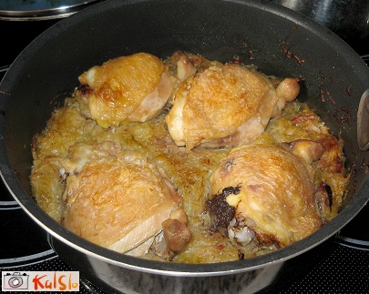 V ponev vlijemo malo olja in na hitro popečemo piščančja bedra, ki smo jih prej osolili. Nato vzamemo meso iz ponve in ga damo na toplo. V olju od pečenja popražimo čebulo, da postekleni, dodamo slanino, še malo popražimo, nato dodamo še kislo zelje, lovorjev list, česen in vegeto. Vse skupaj prepražimo in zalijemo z vodo. Zelje cca 1/2 ure počasi dušimo, po potrebi dodajamo vodo. Ko se zmehča, na njega naložimo popečena bedra tako, da je koža obrnjena gor. Vse skupaj položimo v naprej ogreto pečico na 200 stopinj in pečemo cca 1 uro.