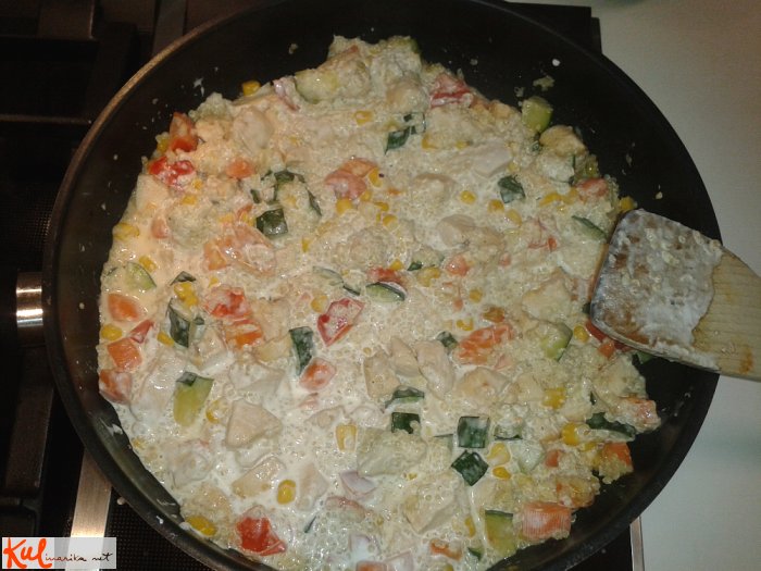 Kuhano kvinojo damo v ponev s piščancem in zelenjavo ter vse skupaj prelijemo s smetano za kuhanje in še malo pustimo na ognju, da se smetana segreje.