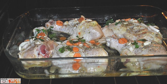 Pečico segrejemo na 180 stopinj in vklopimo ventilacijo. Pečemo približno 1 uro, medtem pa redno zalivamo z vodo, v kateri je raztopljena jušna kocka.