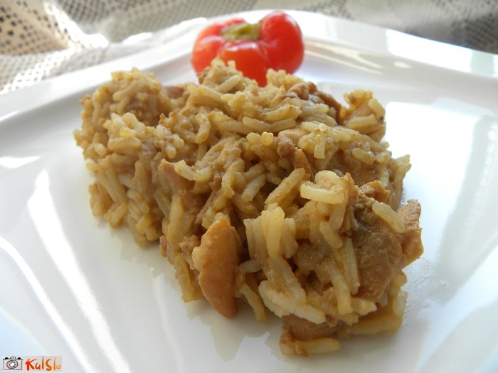 Nato dodamo odcejen in oplaknjen riž. Zvišamo temperaturo ter močno mešamo (približno 5 minut). Riž mora biti lepe svetlo rjave barve.