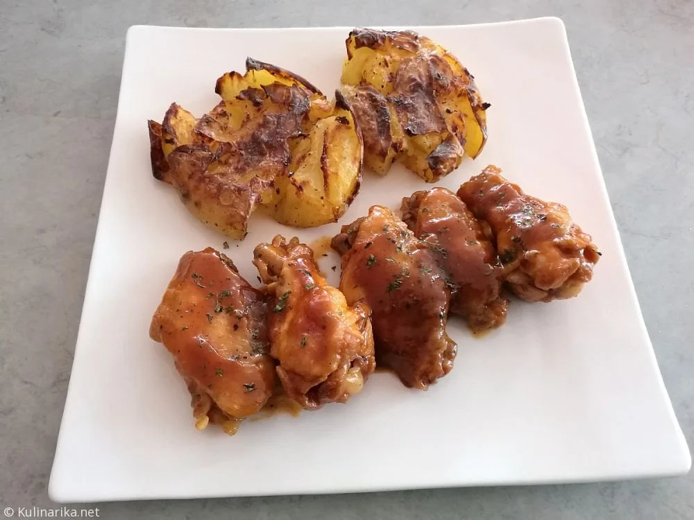 4. Medtem ko se krompir peče, pripravimo perutnice. V ponev s pokrovom damo perutnice in prilijemo za en prst vode. Ponev pokrijemo in perutnice kuhamo na srednje visoki temperaturi, dokler skoraj vsa tekočina ne izhlapi in omaka ne postane gostljata. Večkrat jih obrnemo in premešamo. Proti koncu ponev odkrijemo, in perutnice do konca spečemo.