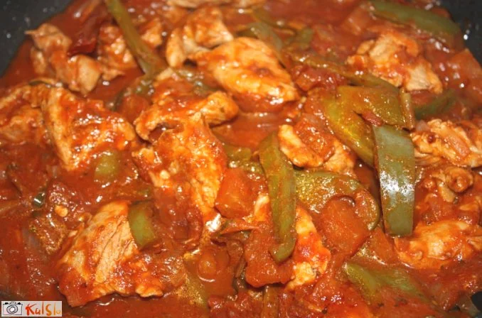 5Na olju, v katerem so vloženi sušeni paradižniki, prepražimo čebulo, dodamo piščančje kocke, česen, na trake narezano zeleno papriko, na trakove narezan sušen paradižnik in vse skupaj še pražimo. Nato dodamo paradižnik, narezan na kocke, paradižnikovo mezgo, sol, poper, baziliko in origano ter kuhamo pokrito 10-15 minut.