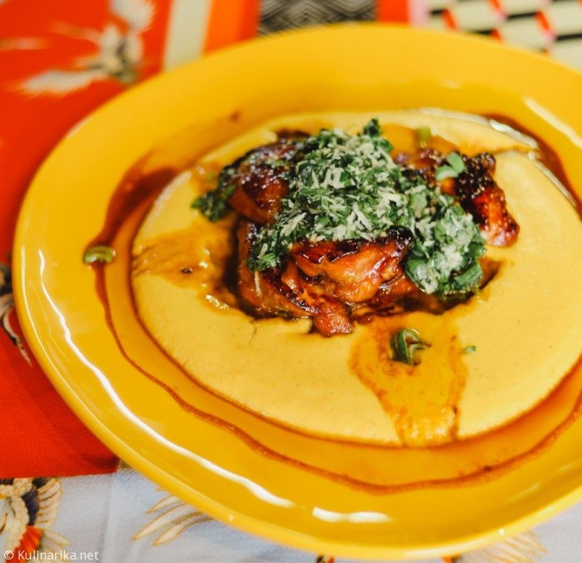 Na koncu pripravite še pesto. V posodico dajte narezana sveža selišča, olivno olje, pest naribanega parmezana, limonin sok, sol in poper. Vse skupaj strite in dobro premešajte. Na krožnik dajte najprej bučni pire, potem pa še stegno, omako in na vrh še pesto.